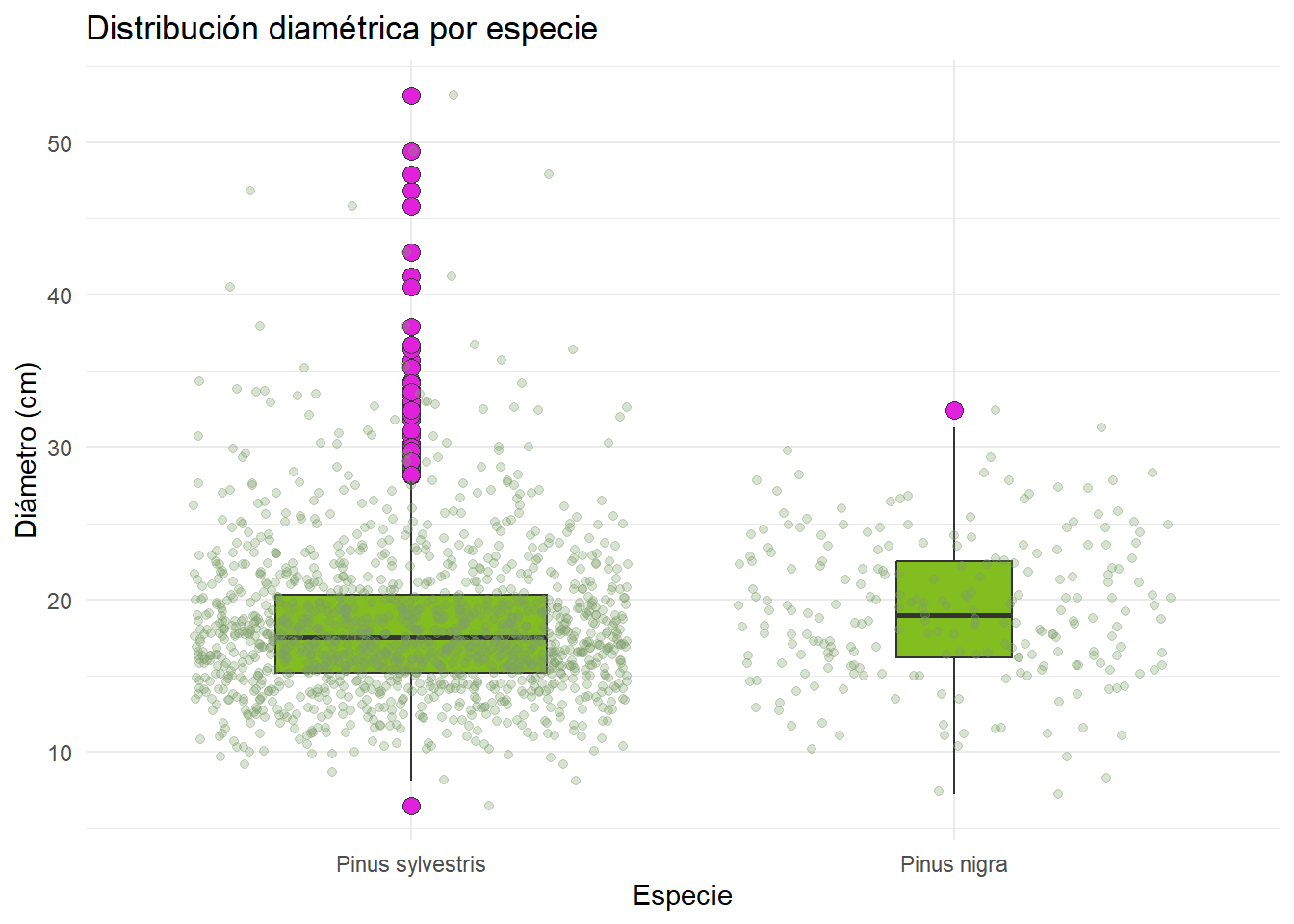 Generar un boxplot de la distribución diamétrica por especie. Además, añadir la distribución de los puntos. Para practicar, utiliza la documentación de geom_boxplot() para modificar distintos argumentos.