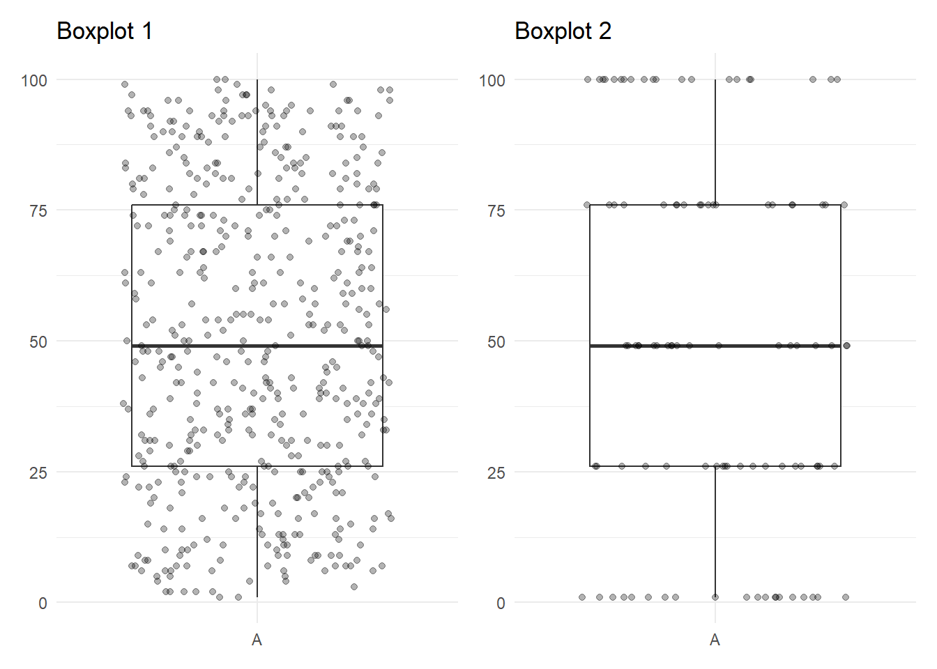 Ambos gráficos tienen exactamente la misma forma, pero como puedes ver en los puntos, los datos son muy distintos. Es por ello que se suelen utilizar variantes del boxplot o el boxplot combinado con otras geometrías como el violin plot.