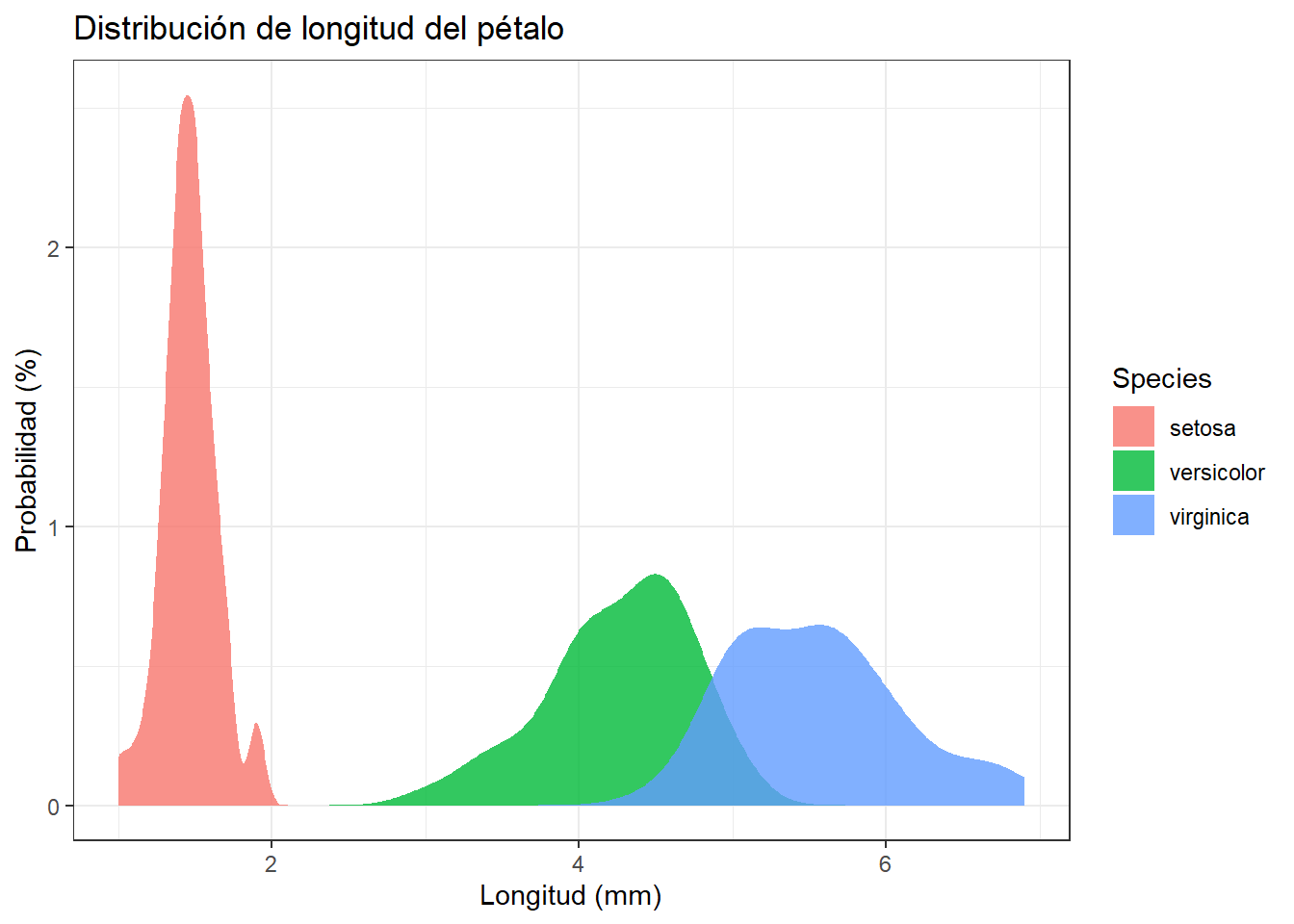 Vamos a ver qué pasa si comparamos la distribución de la longitud de los pétalos de las flores del dataset iris entre las diferentes especies de flores. Para ello, utilizamos el argumento fill en la función aes() para indicar la variable categórica que queremos comparar: