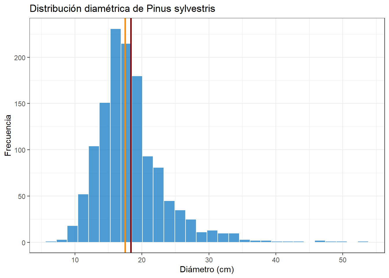 bins: número de intervalos en los que se agruparán los datos. Si no se especifica, ggplot2 utilizará 30 intervalos.binwidth: ancho de los intervalos. Si se especifica, ggplot2 calculará el número de intervalos automáticamente.