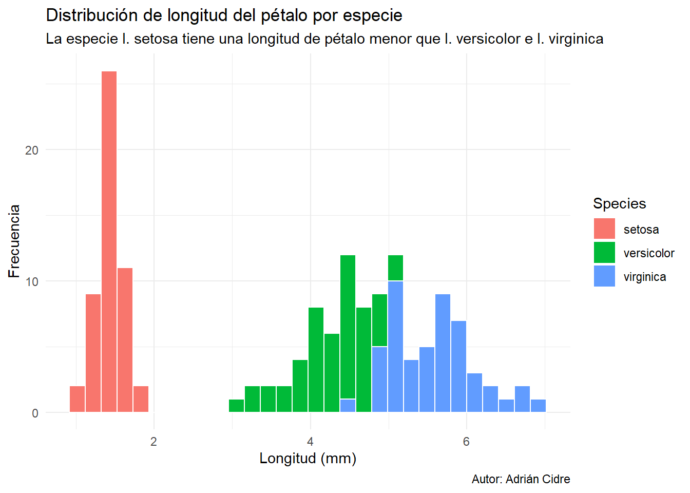 subtitle = "La especie I. setosa tiene una longitud de pétalo menor que I. versicolor e I. virginica",