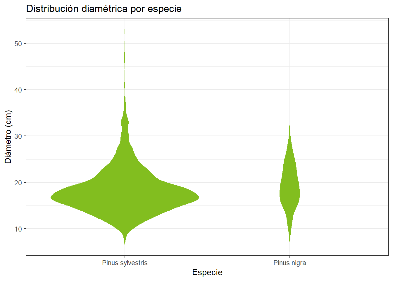 Generar un violin plot de la distribución diamétrica por especie de inventario_tbl. Además, añadir una capa de puntos para ver la distribución de los datos. Visualizar la diferencia entre scale = "area" y scale = "count" y quedarse con el que te parezca más adecuado (en la pestaña “Resultado” se explica cuál es la mejor opción).