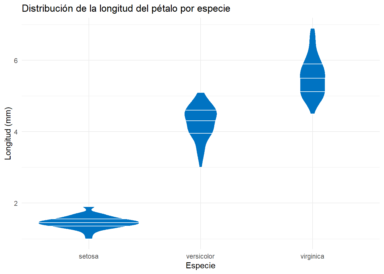 title = "Distribución de la longitud del pétalo por especie",