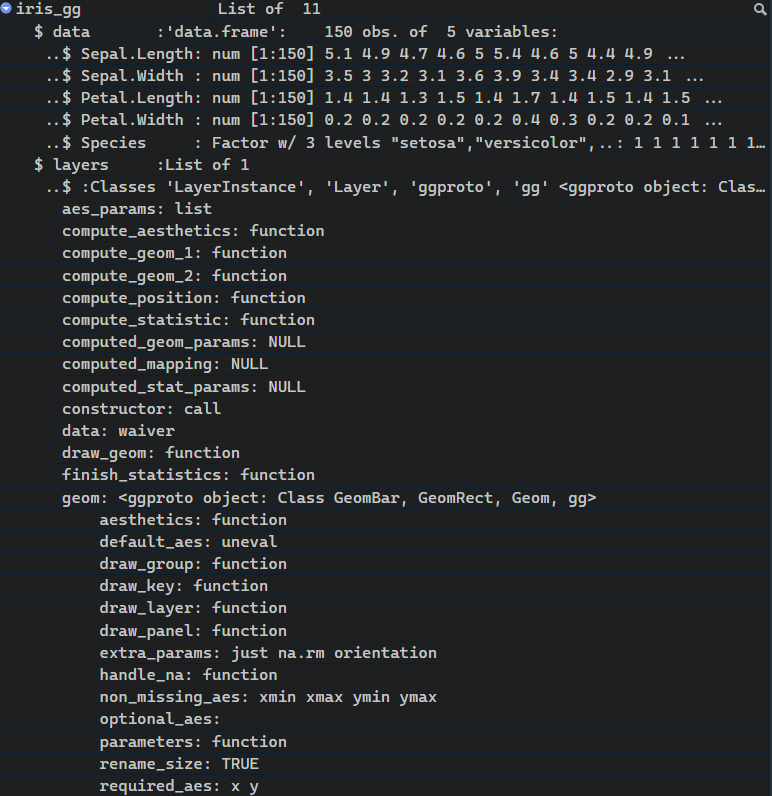 iris_ggEn este caso tenemos un histograma que hemos creado en la Capítulo 4 con el tema predefinido de ggplot2. Si vamos a la pestaña Environment podemos ver que es una lista con 11 elementos Figura 10.1.
