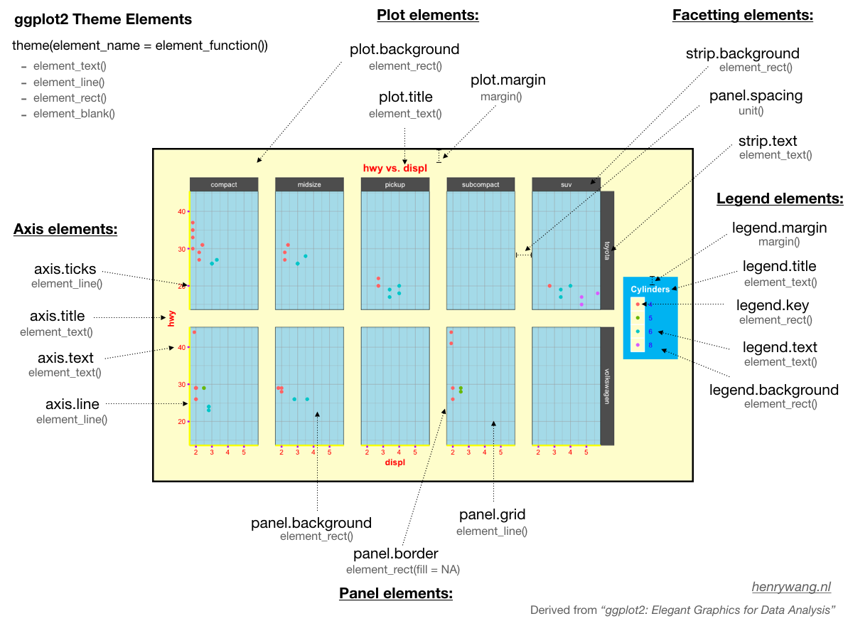 - nombre_elemento: el nombre del elemento se refiere a qué queremos modificar. En la Figura 10.2 serían elementos como plot.background, plot.title, legend.title, panel.background…