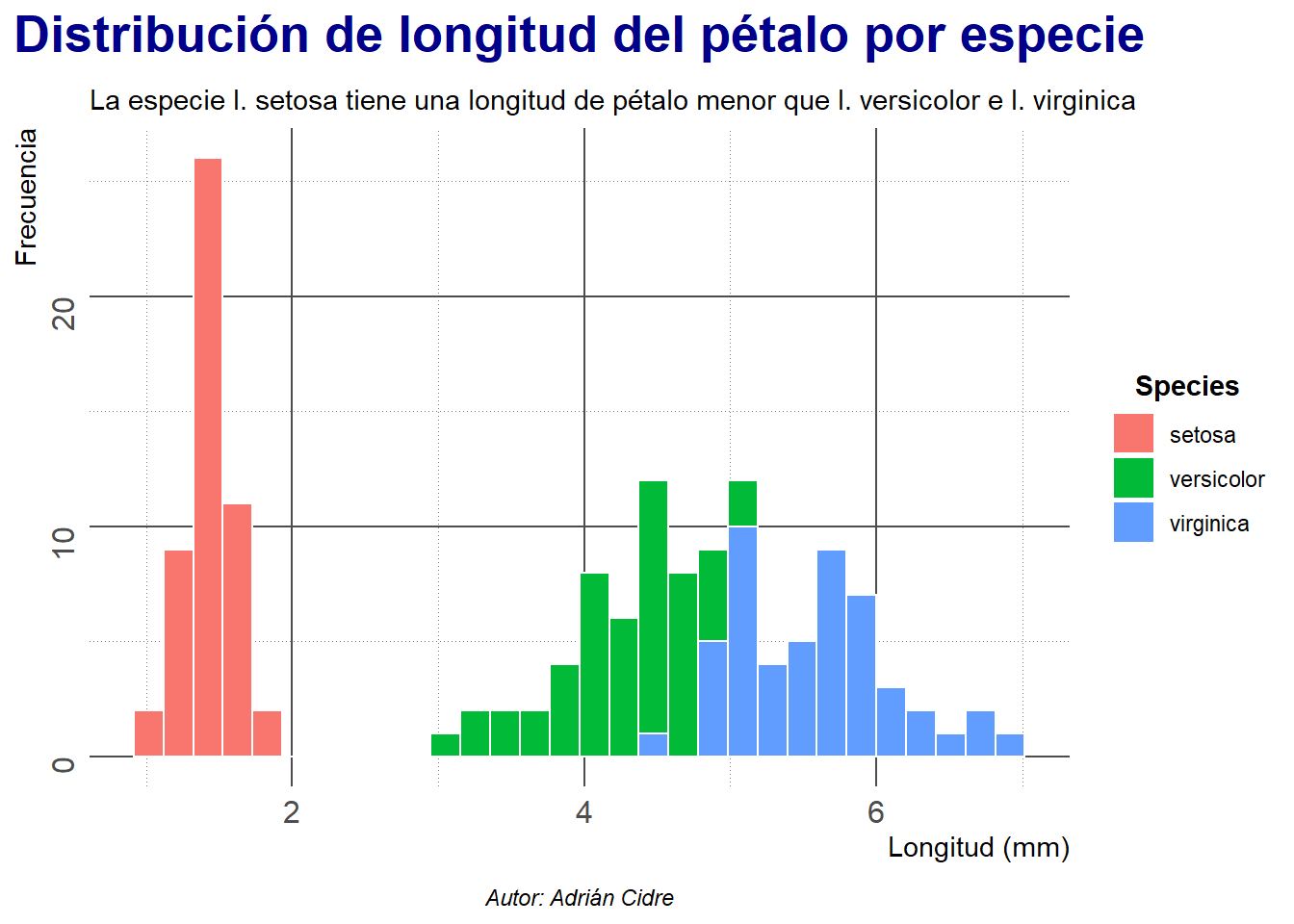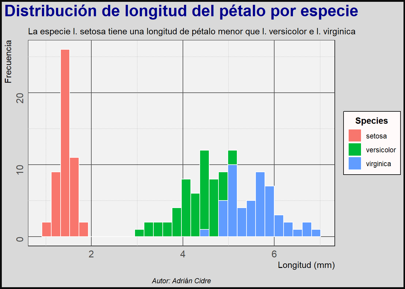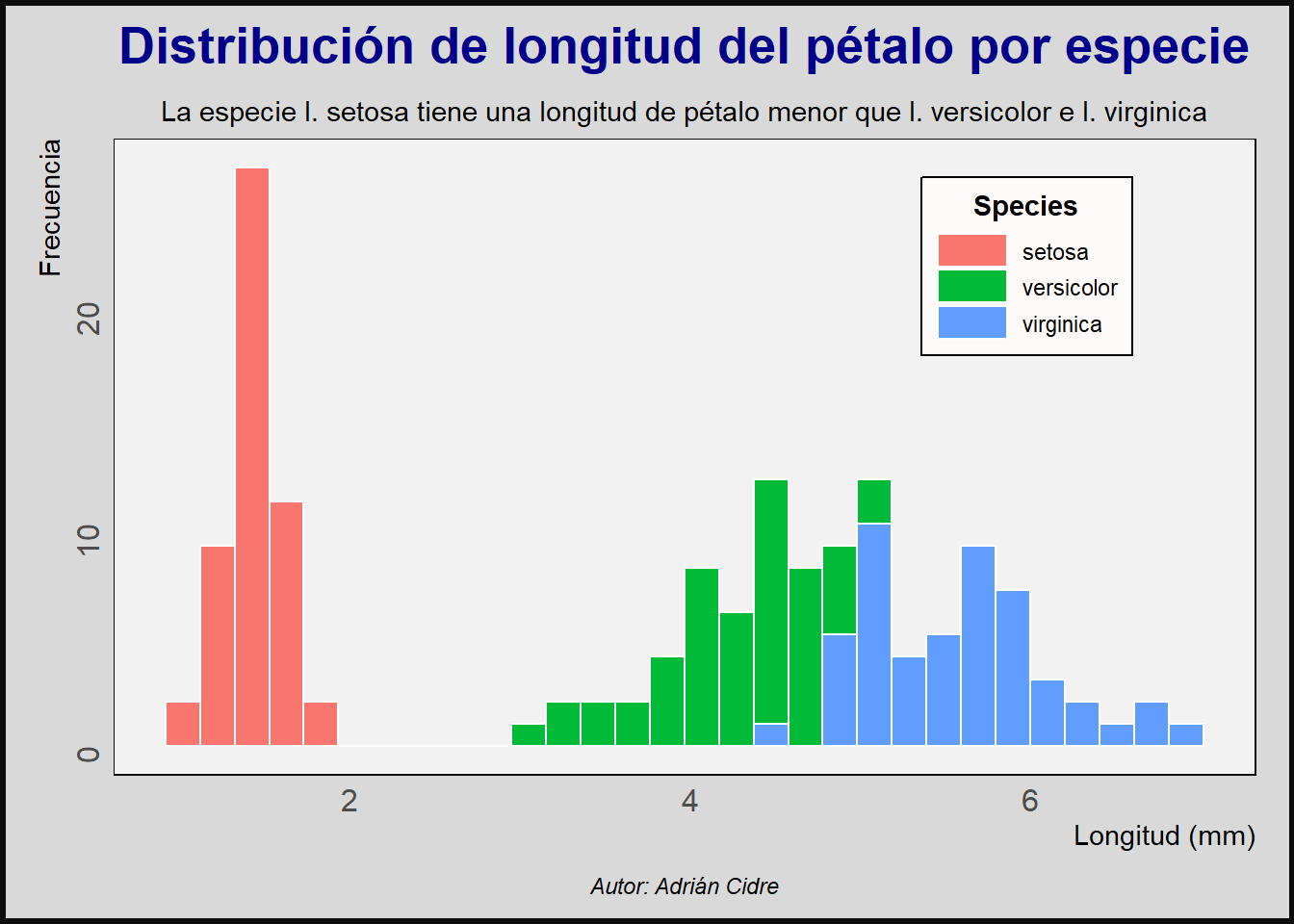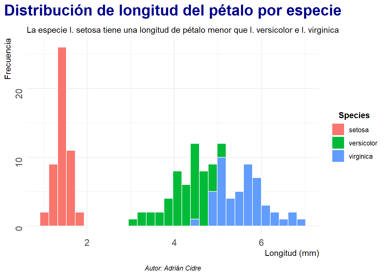 subtitle = "La especie I. setosa tiene una longitud de pétalo menor que I. versicolor e I. virginica",