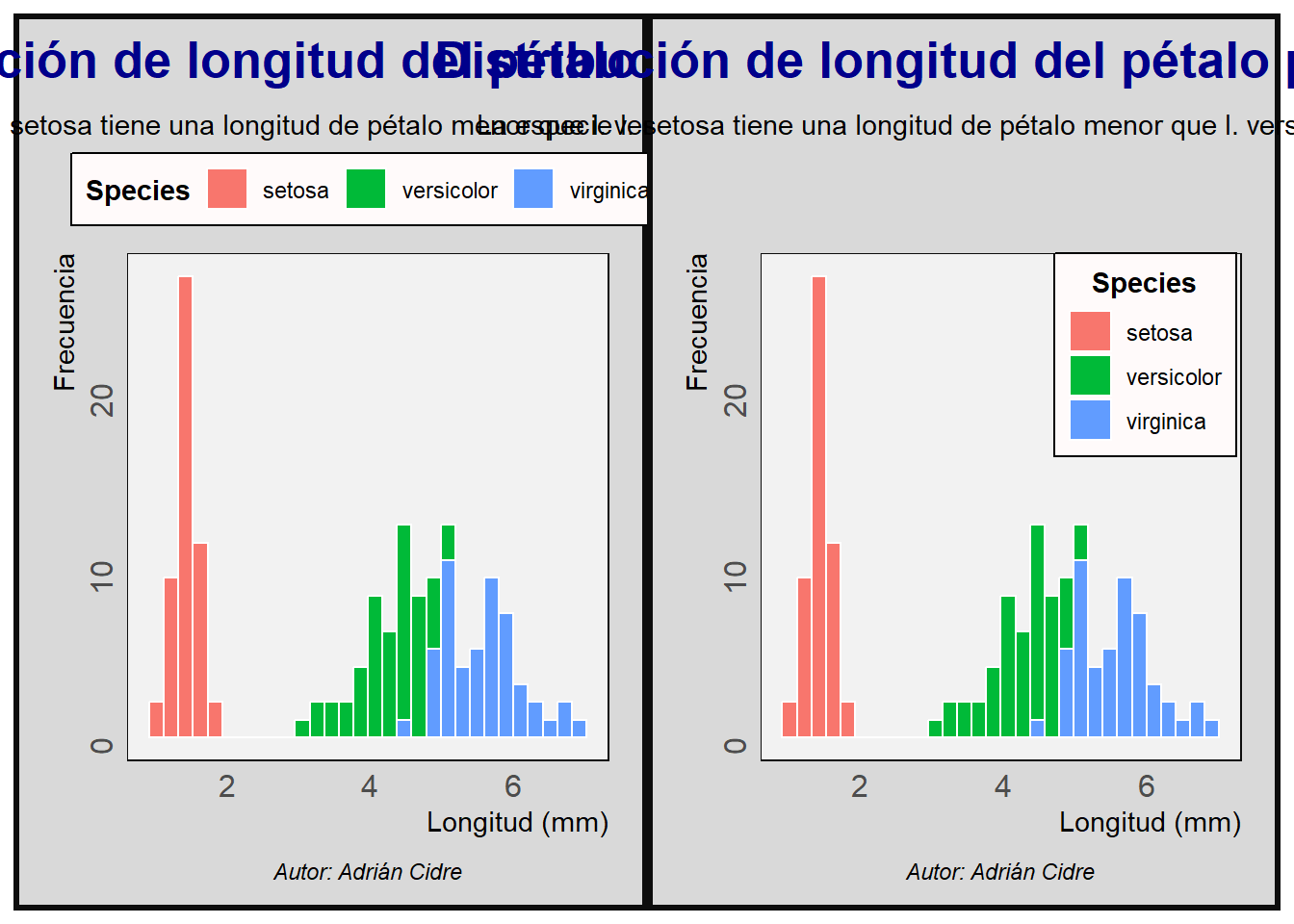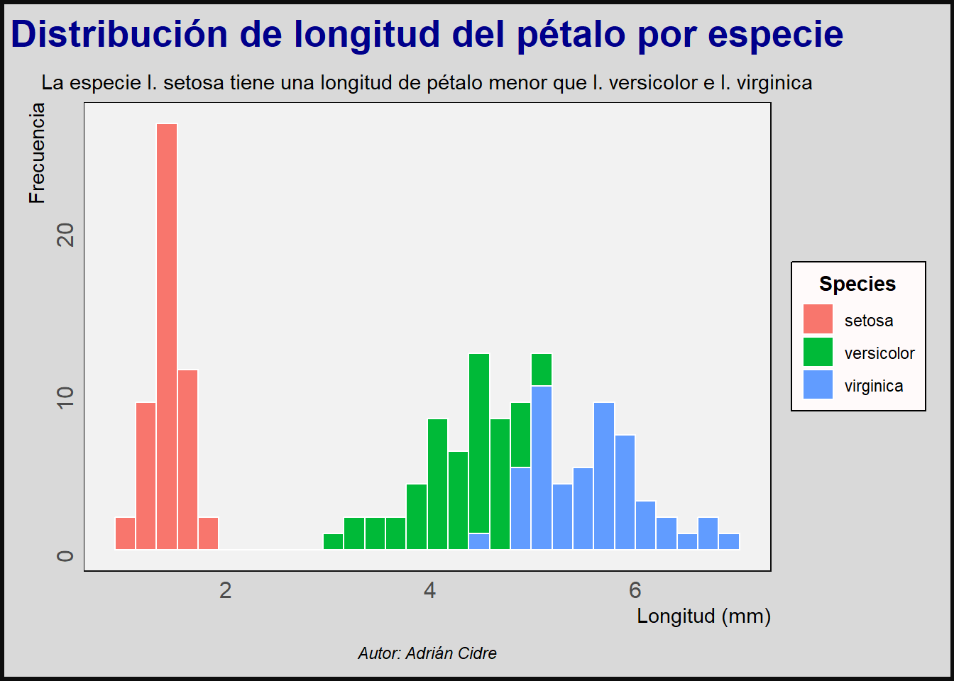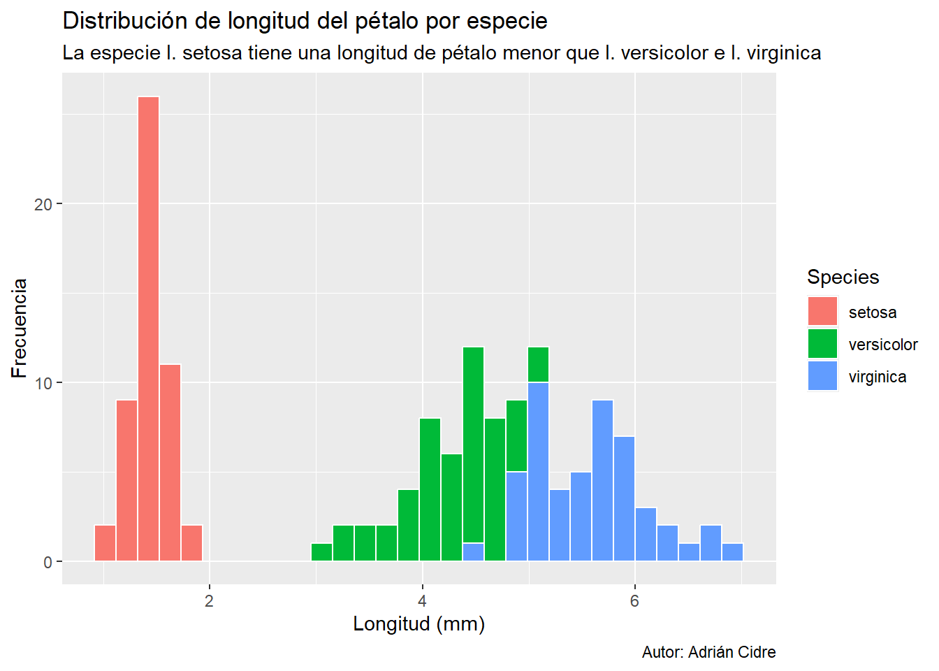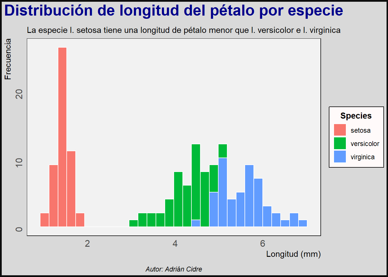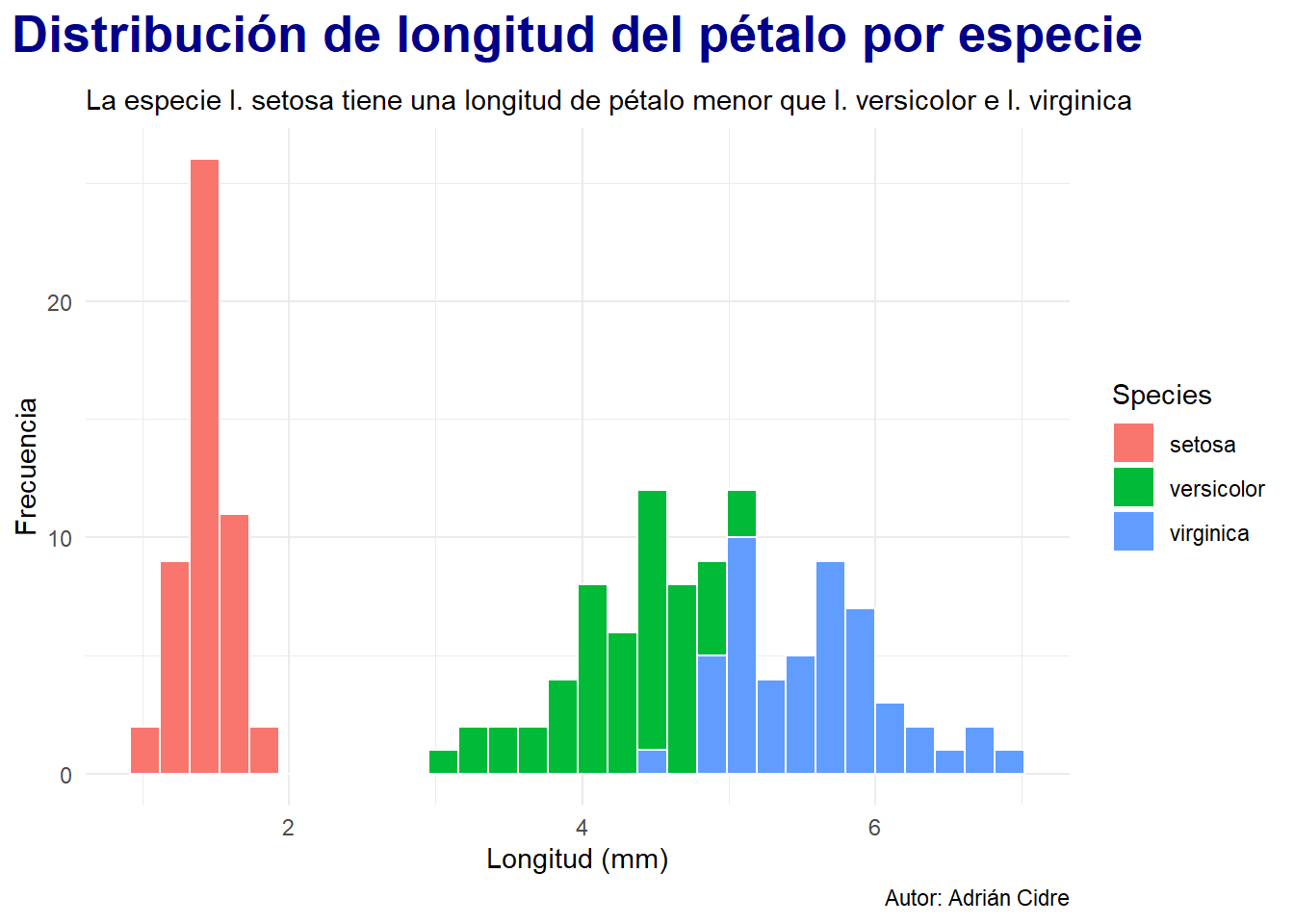 subtitle = "La especie I. setosa tiene una longitud de pétalo menor que I. versicolor e I. virginica",